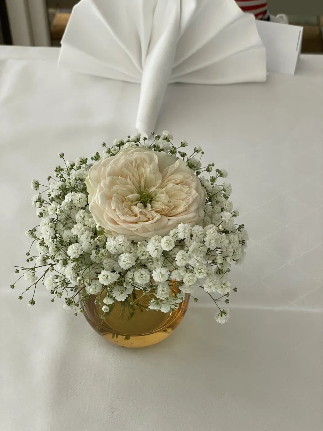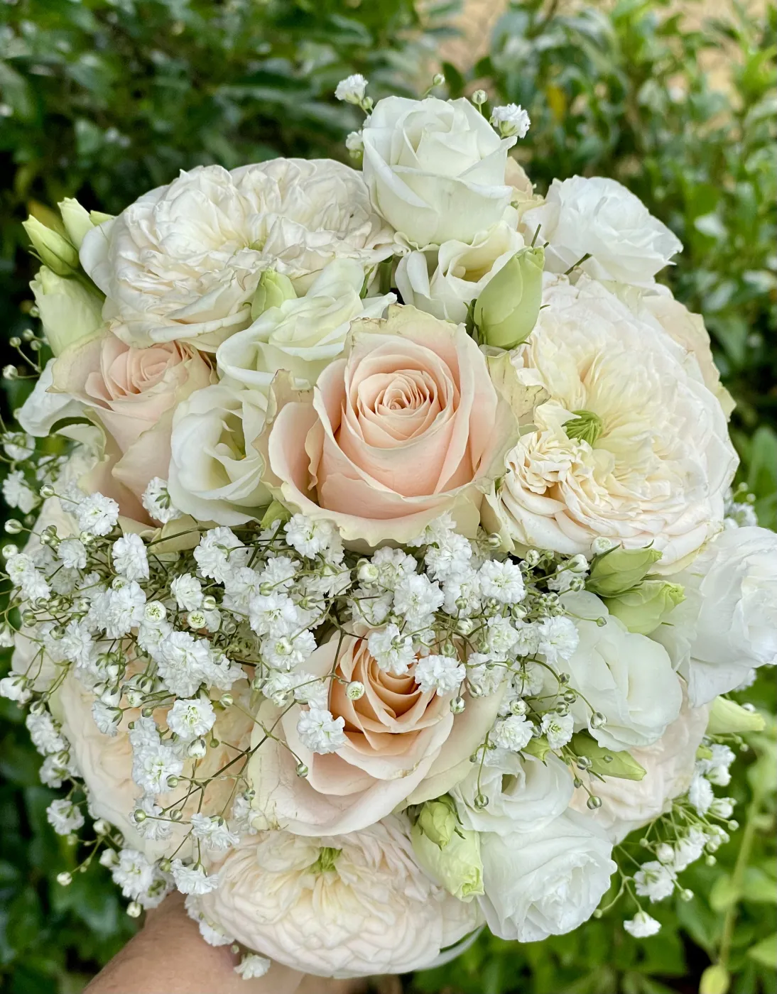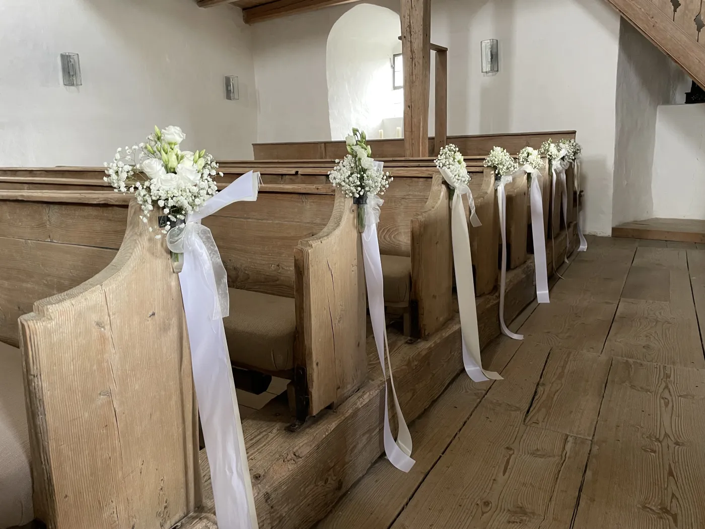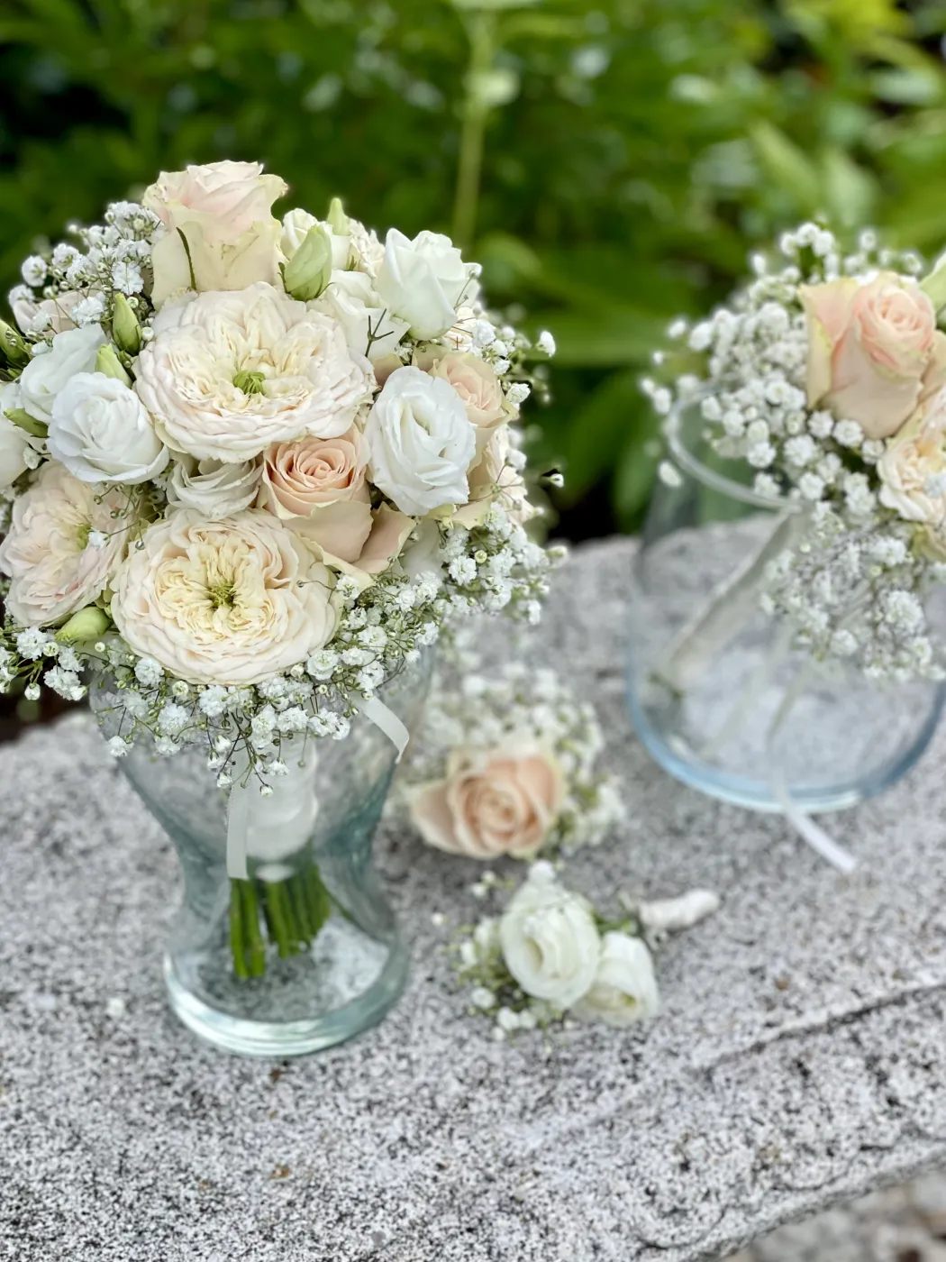 Hannah und Florian mit Schleierkraut gepaart mit Creme und apricotfarbenen Blüten. Eine wunderschöne Hochzeitstrauung in der Burgkapelle und anschließender Feier.